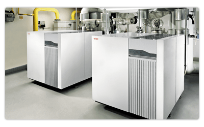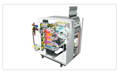 Modele o nominalnej wydajności do 1100kW zawierają pompę obiegu pierwotnego kotła w standardowym wyposażeniu (na życzenie może zostać usunięta)..